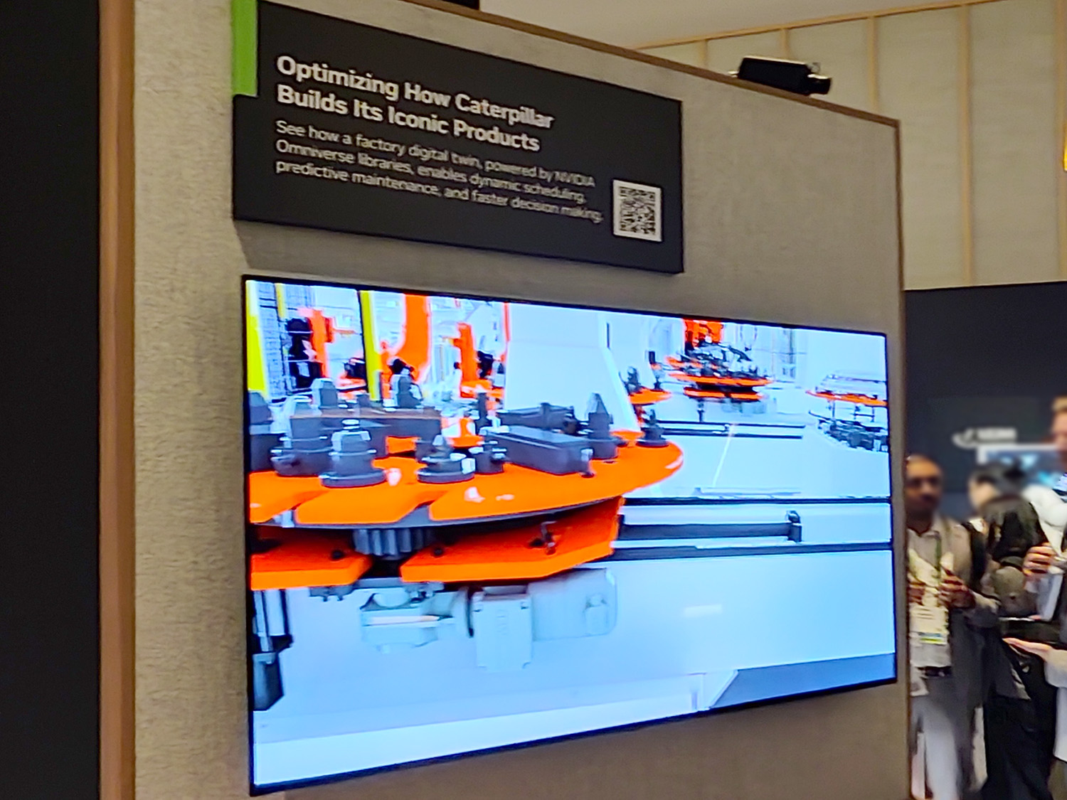 NVIDIAの展示ブースでも、建築重機を開発するキャタピラーの工場をNVIDIAの『Omniverse』上に再現したデジタルツイン・ファクトリーを紹介し、アイコニックな建機コンポーネントの製造プロセスを最適化する様子がデモされた。デジタルツインにはライン上の設備・搬送・作業ステップがモデリングされ、センサーやMESからのデータと連携してAIがスループットや設備稼働率の最大化、予知保全のタイミング、段取り替えのシナリオなどをシミュレーションする。AI駆動のデジタルツイン・ファクトリーは現場で試す前に最適なレイアウト・運転条件を見つけることが可能であり、ダウンタイムとコストを削減できる。