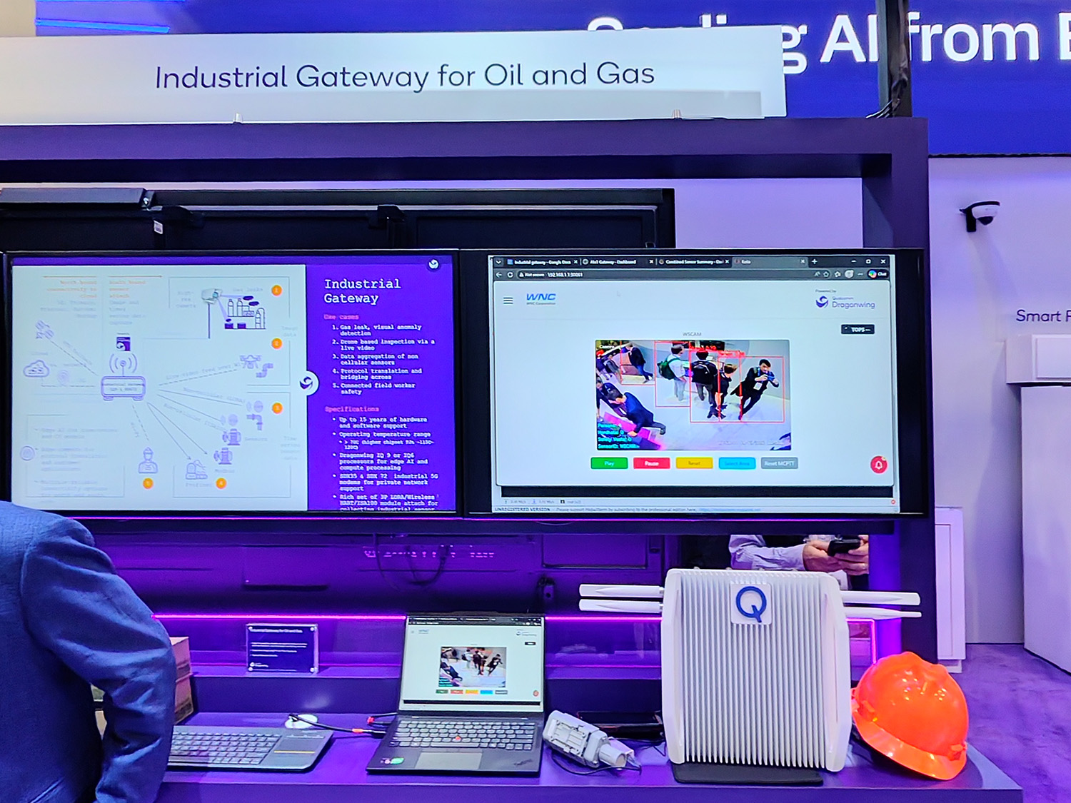 クアルコムのブースでは、IoT向けのチップセットとなる『Dragonwing』を使ったソリューションを展示。ガスや油田向けの産業ゲートウェイのデモを行った。これは現場のセンサーデータや、作業員の動きのビデオデータをゲートウェイに集積し、エッジでAI処理を行うもの。カメラ映像から漏えい・炎・煙・作業者の転倒などを検出するビジョンAI、時系列データから異常兆候を検知する機械学習などに利用できる。『Dragonwing』の高性能なNPUにより、AI処理が迅速に行われる。