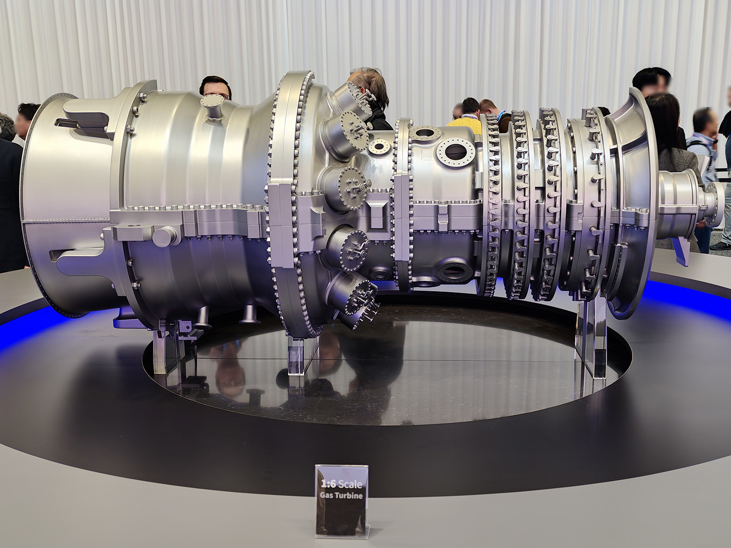 Doosanは、ブース中央に大型の380MW級ガスタービンの1/6スケール模型を設置し、来客からの注目を集めた。これはAIデータセンター向けの電源であり、アメリカの大手IT企業からすでに5基受注しているとのこと。さらに、次世代タービン発電機として、2028年に100%水素燃料タービンを商用化するロードマップも示し、火力から水素への橋渡し技術としてアピールしていた。