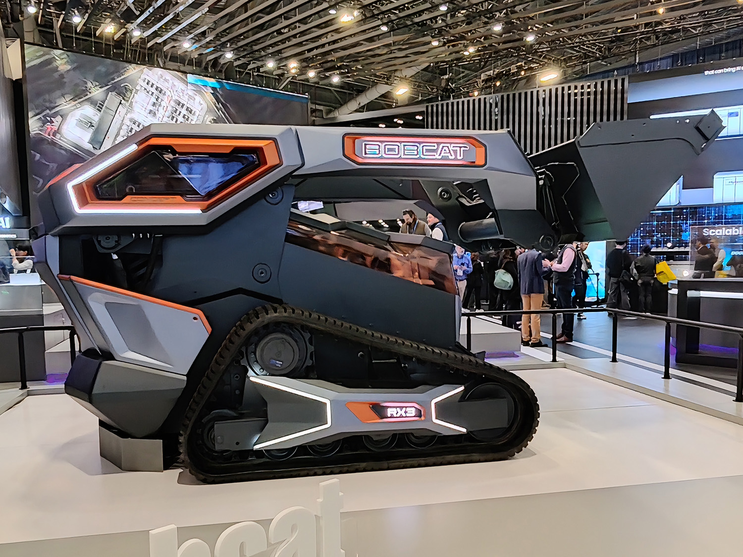 また、傘下のDoosan Bobcatは次世代コンセプトローダー『RogueX3』を発表し、実物大の模型を展示した。ゼロエミッションの電動駆動で、静音かつ高トルクな電気モーターを採用。従来のディーゼル機械より低騒音・低振動を実現した。モジュラー設計で、キャブの有無やホイール・リフトアームやアタッチメントを自由に組み替えできる。センシングデータをもとに障害物回避や作業パターン学習、遠隔操作支援などを可能にするAI機能も搭載しているが、コンセプトモデルであり商用化は未定だ。