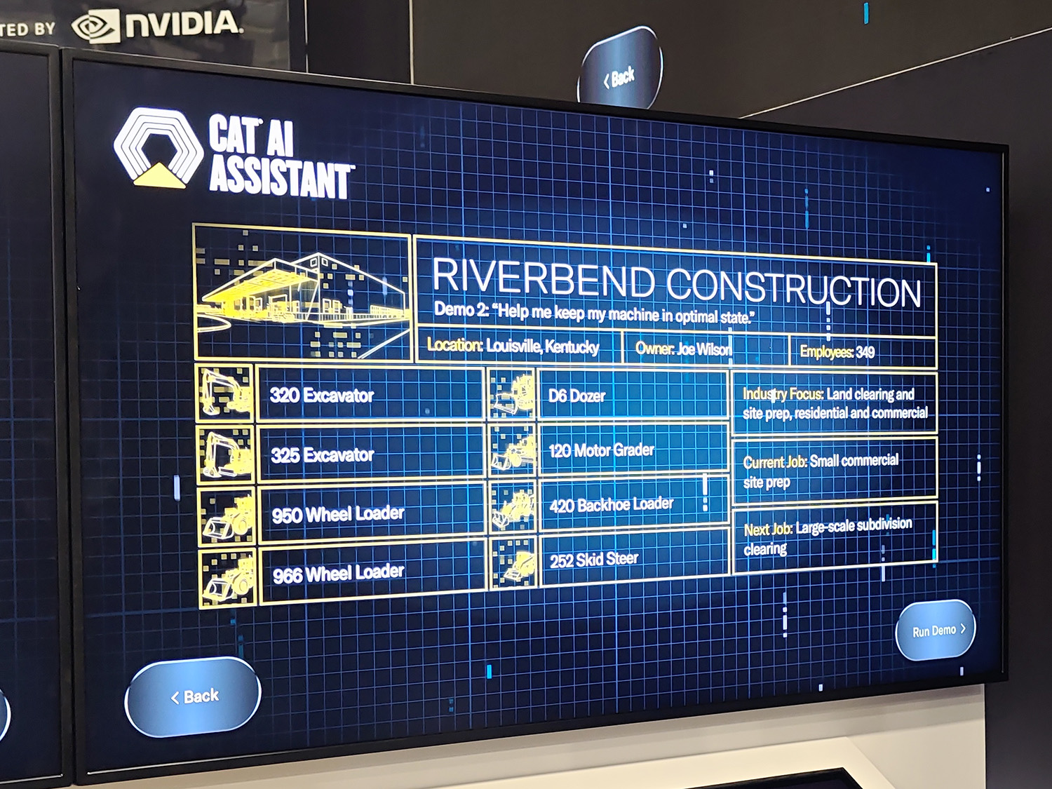 キャタピラーは「Industrial AIと自律施工の次の時代」をテーマに展示を行い、重機のAI操作のデモを行った。『Cat AI Nexus』は、AIによるリアルタイム作業ガイダンス、安全支援、フリート管理を行う。また、今回『Cat AI Assistant』も発表。これはNVIDIAのRiva音声モデルなどをベースにしたアシスタントAIであり、音声対話で運転席や整備現場から重機に質問すると、操作ガイドやメンテナンス手順、推奨設定をリアルタイムで提示してくれる。さらに危険エリア接近時の警告や、架線・埋設物の回避などの安全機能とも連携する。