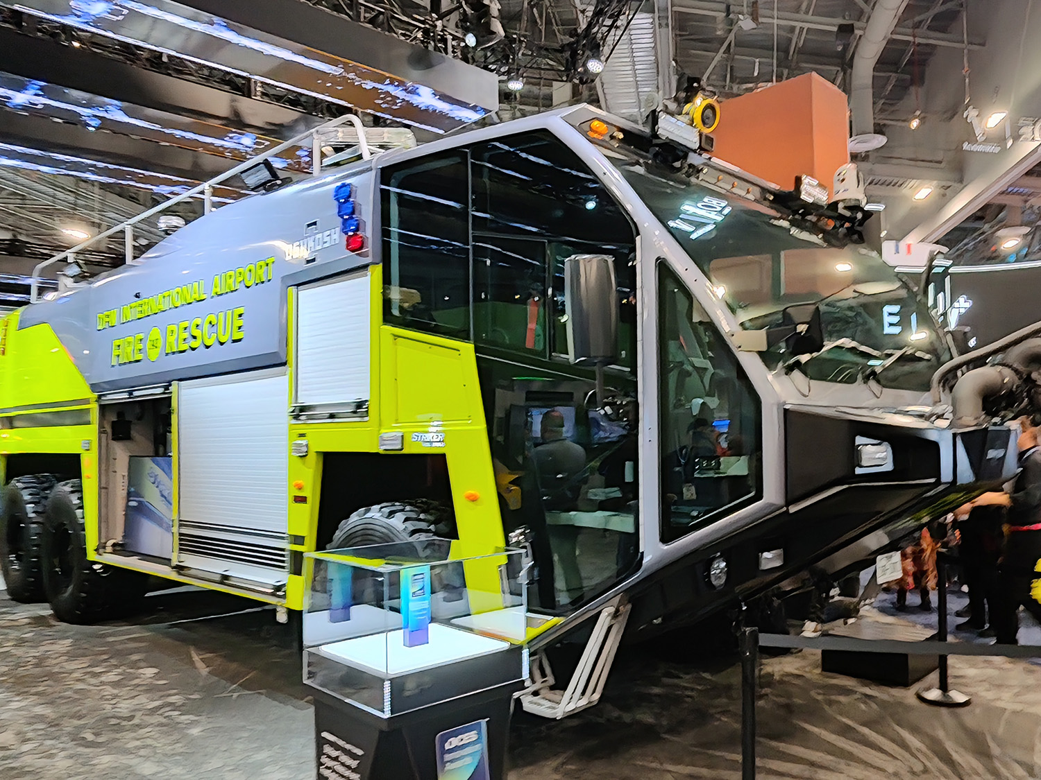 「空港」ゾーンには『Striker Volterra 電動空港用消防車』を展示。電動車であることから、従来のディーゼル車より高速・静粛、かつ素早く滑走路へ移動可能。機動力と環境性能を両立する次世代空港消防車である。「工事現場」ゾーンでは、JLGブランドの電動ブームリフトを展示。ロボットアーム的なエンドエフェクタを組み合わせ、高所作業での繰り返しタスクを自動化する。建機の先、すなわち「建設ロボット」という位置づけの製品になる。