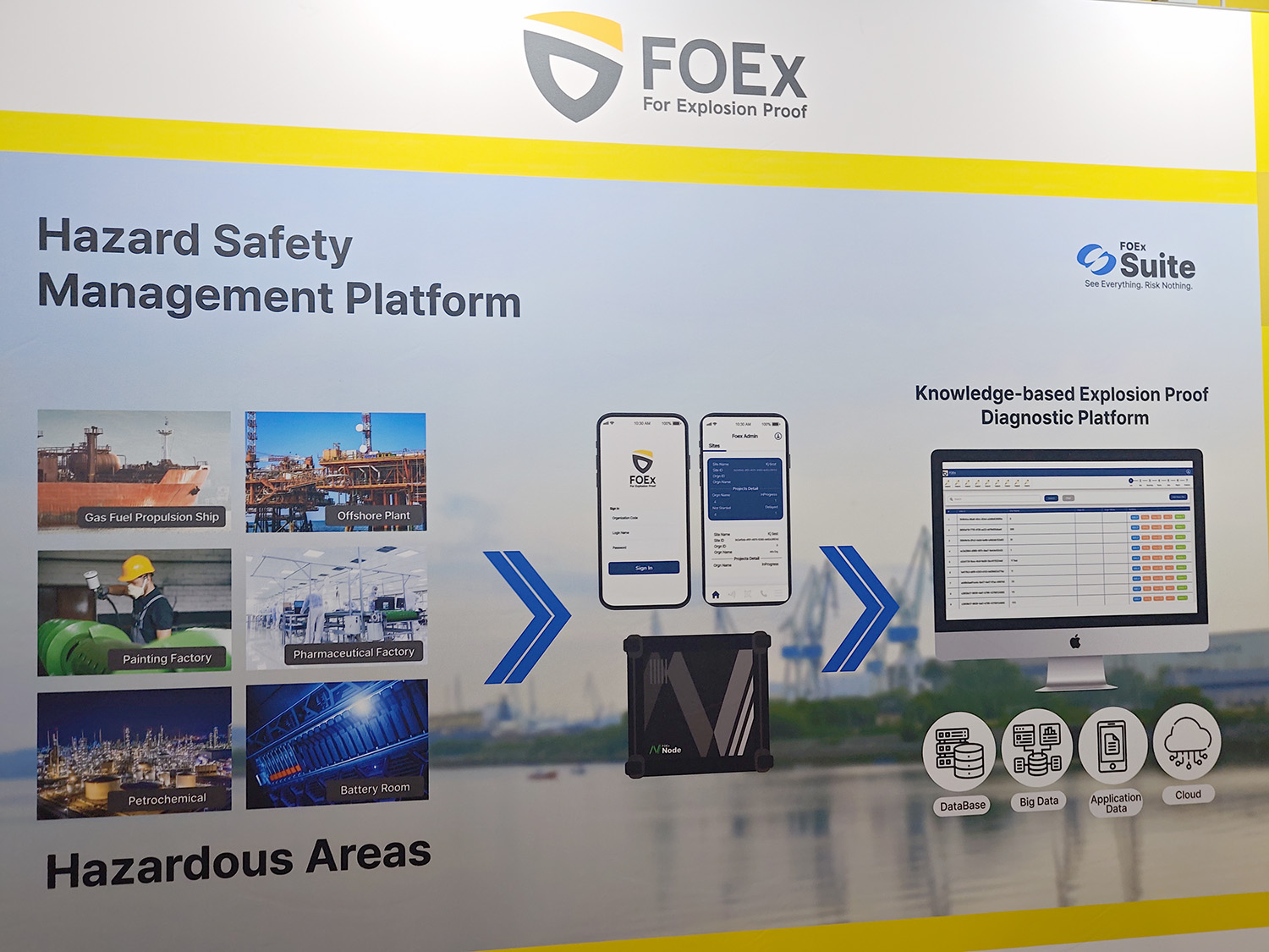 FOExは、爆発のおそれもある危険環境向けのクラウド型安全管理SaaS『FOEx Suite』のデモを行った。LNG・水素・アンモニア船、石油・化学プラント、研究所などの防爆エリアをターゲットとしており、設備台帳と点検・認証情報を一元管理する。特徴は防爆評価アルゴリズムを組み込んだクラウドDBとモバイルアプリの連携で、現場作業者は防爆機器のQRコードやIDタグを読み取るだけで、該当機器の規格・ゾーン区分・必要な点検項目が自動表示され、ガイド付きで巡回点検を進めることができる。
