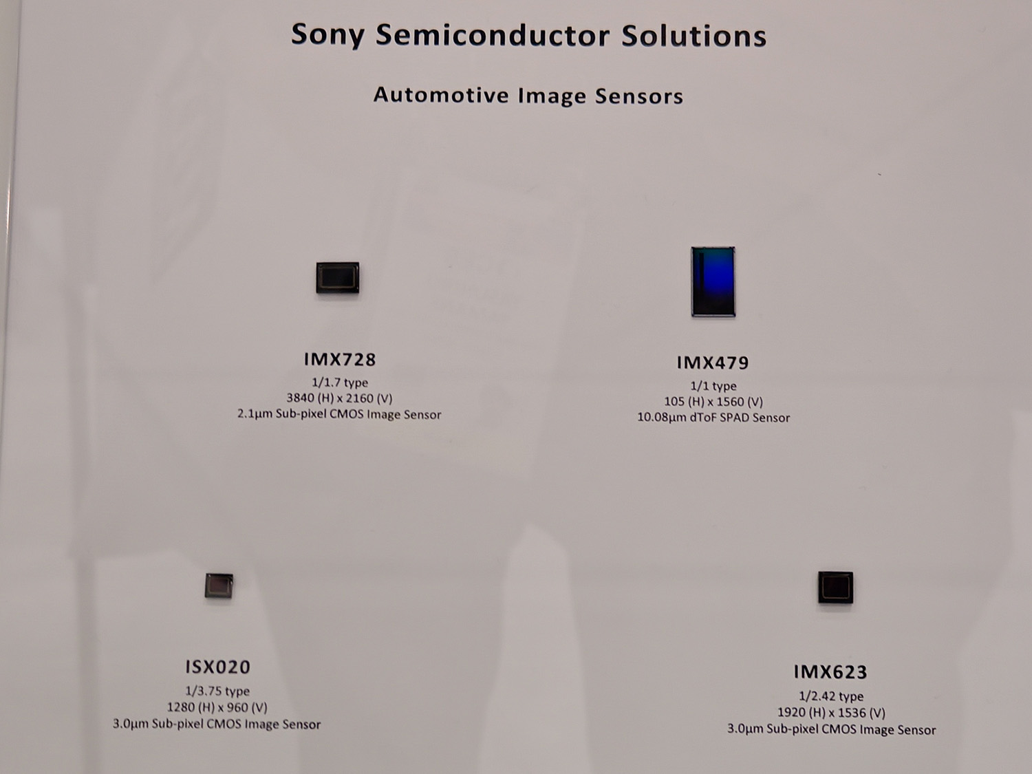 『IMX479』は、車載LiDAR向けSPAD(単一光子アバランシェダイオード)深度センサー。dToF方式、520ライン構成、画素ピッチは約10 µm。1型相当の光学サイズ、波長940 nm帯の赤外光に最適化しており最大約20 fpsで距離計測が可能だ。このほか、センサーと画像処理を統合した車載向けのカメラチップセット『ISX020』『ISX021』も展示された。