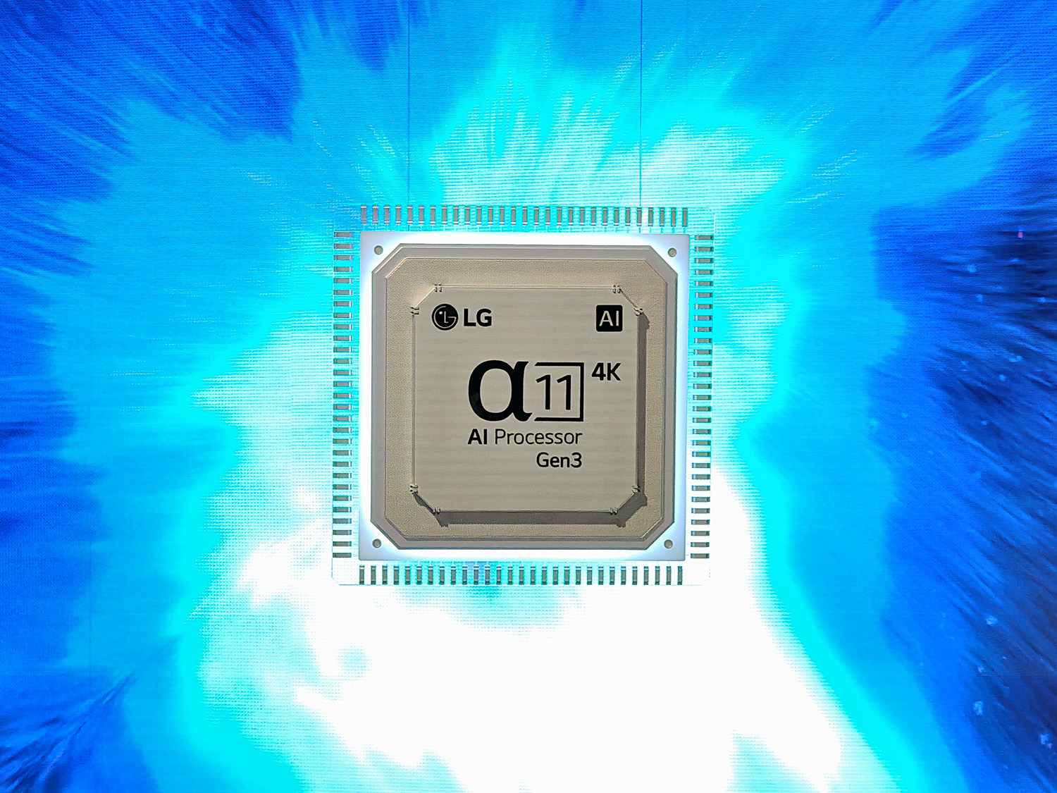 大手家電メーカーのスマートTVでは上位モデルを中心に、汎用チップセットではなく自社開発の専用モデルを搭載する製品が多い。LG Electronicsは『α11 AI Processor Gen 3』を紹介。最大3840 x 2160ピクセルの4Kパネル向けで144Hzの可変リフレッシュレートやHDMI 2.1入力に対応、前世代の『α9』比でCPU・GPU性能とAI演算性能を大幅に引き上げた。ディープラーニングを用いた「AI Picture Pro」によりノイズ低減とAI超解像を行い、細部のディテールと輪郭を強調。環境光センサーと連動する「AI Brightness Control」や、音声面の性能を引き上げる「AI Sound Pro」も搭載している。