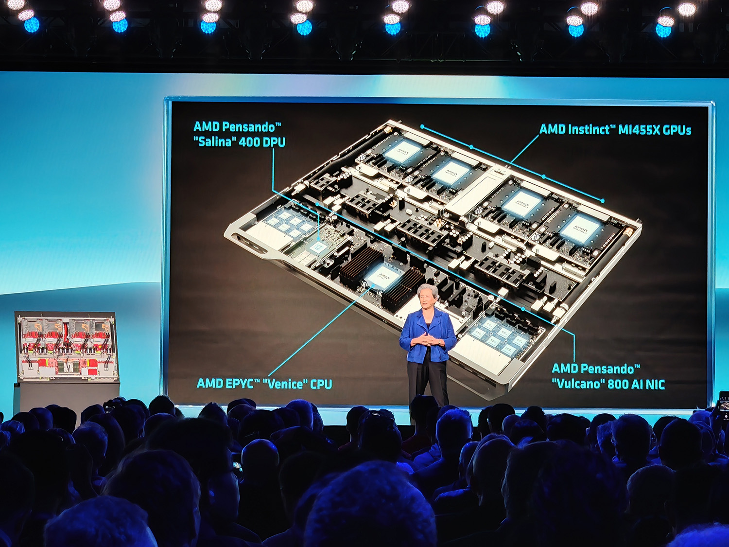 AMDの『Instinct MI400』『同 MI455X』では、データセンター向けのアクセラレータGPUを発表。対抗製品はNVIDIAのRubin世代とのこと。TSMC 2nm・3nm世代プロセスとHBM4メモリを組み合わせた設計となっている。FP4換算で最大40PFLOPS、FP8で20PFLOPSと前シリーズより2倍のAIスループットを実現している。同時に発表された『Helios』は『Instinct MI455X』を72基収めたラックサーバーであり、ラック1台あたり最大2.9エクサFLOPSのFP4性能を持つ