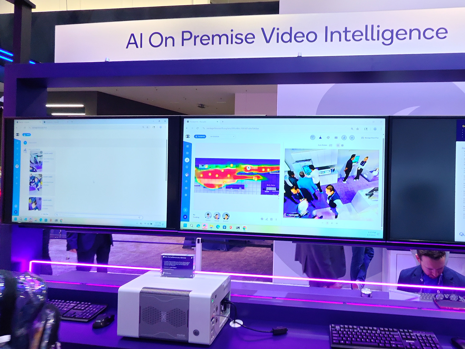 一方、クアルコムのブースでは産業向けチップセットDragonwingをベースにしたオンプレミスAIアプライアンスを見せた。これはクラウド並みのAI性能をローカルで使うことを強く打ち出したビデオ解析のデモだ。デスクトップサイズの筐体に『Qualcomm Cloud AI 100 Ultra』などの推論アクセラレータカードを搭載し、最大870TOPSのAI性能で数10台以上のカメラからの映像を同時に処理することが可能という。