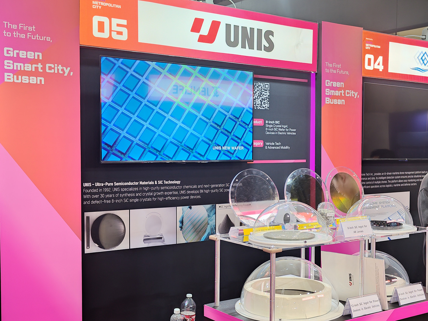 韓国のスタートアップでは、釜山メトロポリタンパビリオンに出展したUNISが「韓国初の8インチSiC量産ウェハ」の展示を行った。6インチより有効面積が大幅に増えコストダウンと量産性向上に貢献できる。また現在12インチの開発が完了し量産に向けて動いている。同社はロジックファウンドリではなく、SiC結晶成長とウェハ加工に特化した素材メーカーであり、4H-SiC結晶、導電型・半絶縁型など、材料スペックそのものを特徴としている。ターゲット分野は3つでEVインバータなどの車載パワー半導体、5G基地局やレーダー向けのGaN-on-SiC高周波デバイス用基板、そしてARグラス向けSiC光学基板である。