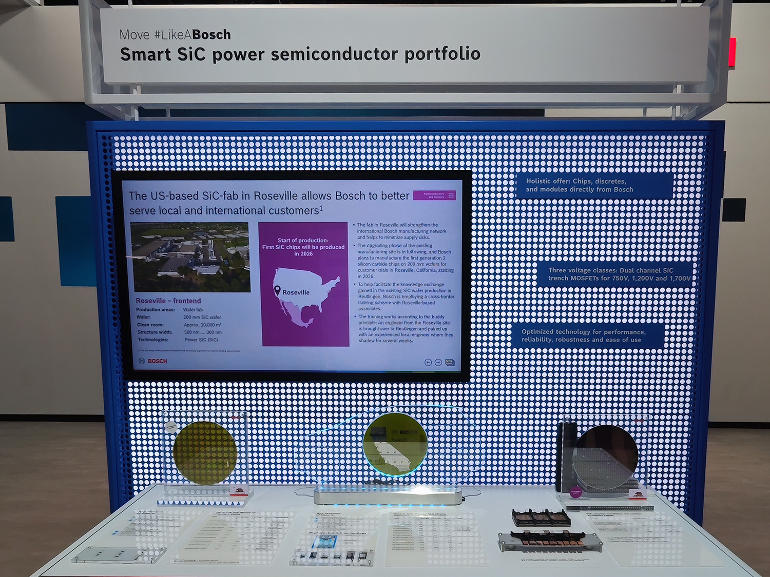 Bosch Semiconductorsは、SiCパワー半導体や各種センサーを自動車電動化とAI化に向けた省電力・高効率デバイスとして展示した。AI処理を前提にした、自社独自のセンサープラットフォーム採用の各種MEMSセンサー群も展示。たとえばジャイロ+加速度+オンチップAIを組み合わせることで、車両姿勢変化や路面ノイズ、ドライバーの動きまでをセンサー側で事前解析し、ECU(Electronic Control Unit、エレクトロニック・コントロール・ユニット)側の負荷と電力消費を抑えるスマートセンサーとして動作可能だ。