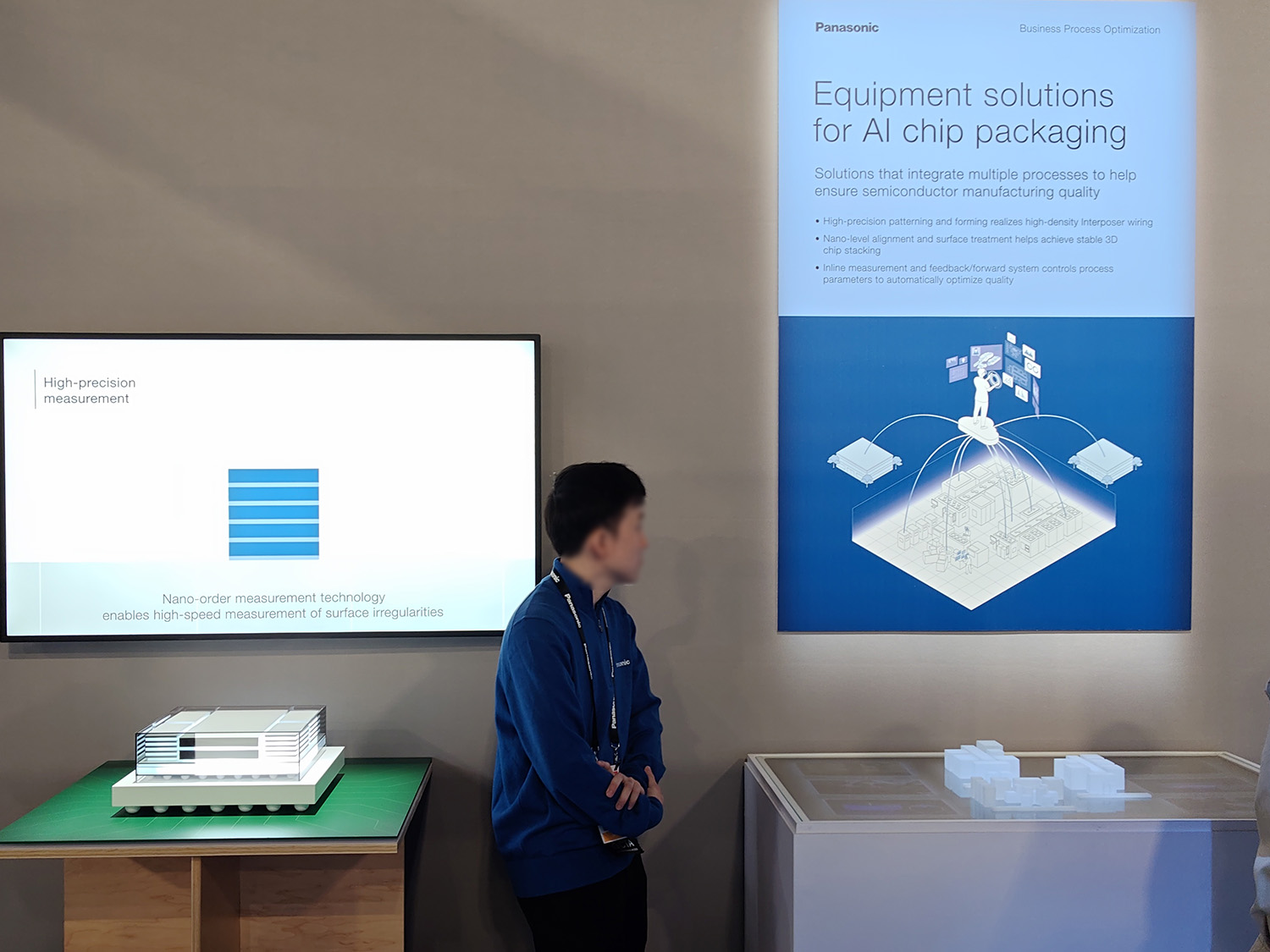 パナソニックは、AIチップを含む高集積半導体の「中工程」向けの製造装置を説明した。中工程はウエハの加工(前工程)とパッケージング(後工程)の間に位置し、微細化と多層化が進むAI半導体をより小さく、高密度に実装できるようにする装置群である。 長年、電子機器メーカーとして培ったプロセス技術を応用し、微細配線の形成精度や重ね合わせ精度を高めることで信号遅延やリークを抑えつつ、チップ同士を立体的に積層できることを強調した。結果として同じAI性能をより小さなチップやモジュールに収めることが可能になる。つまり製造プロセスそのものが、省電力AIを左右する重要な要素となっている。