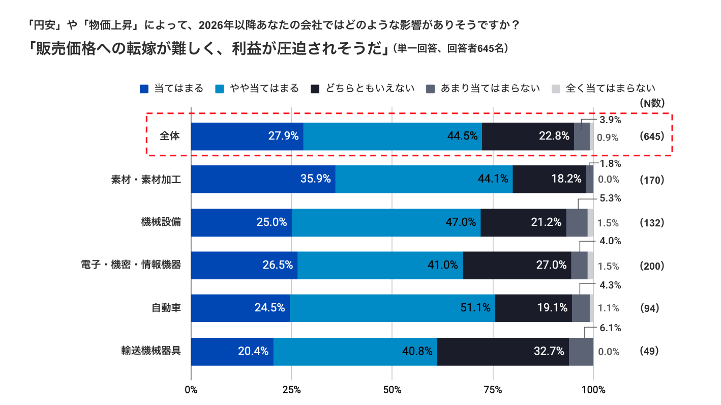 サプライチェーンの不安定化や為替変動、物価上昇、脱炭素、人手不足など、製造業を取り巻く環境は2026年に向けて複数の課題が同時に進行しています。こうした外部環境の変化を、製造業に従事する課長以上の役職者645名(業種別:素材・素材加工、機械・設備、電子・精密・情報機器、自動車、輸送機械器具、詳細は末尾に記載)がどのように捉えているのかを明らかにするため、本調査を実施しました。