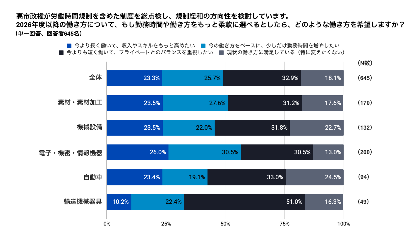・労働時間規制について「今より長く働きたい」層が約半数。長く働く意欲を持つ層が一定存在する実態が明らかになりました。