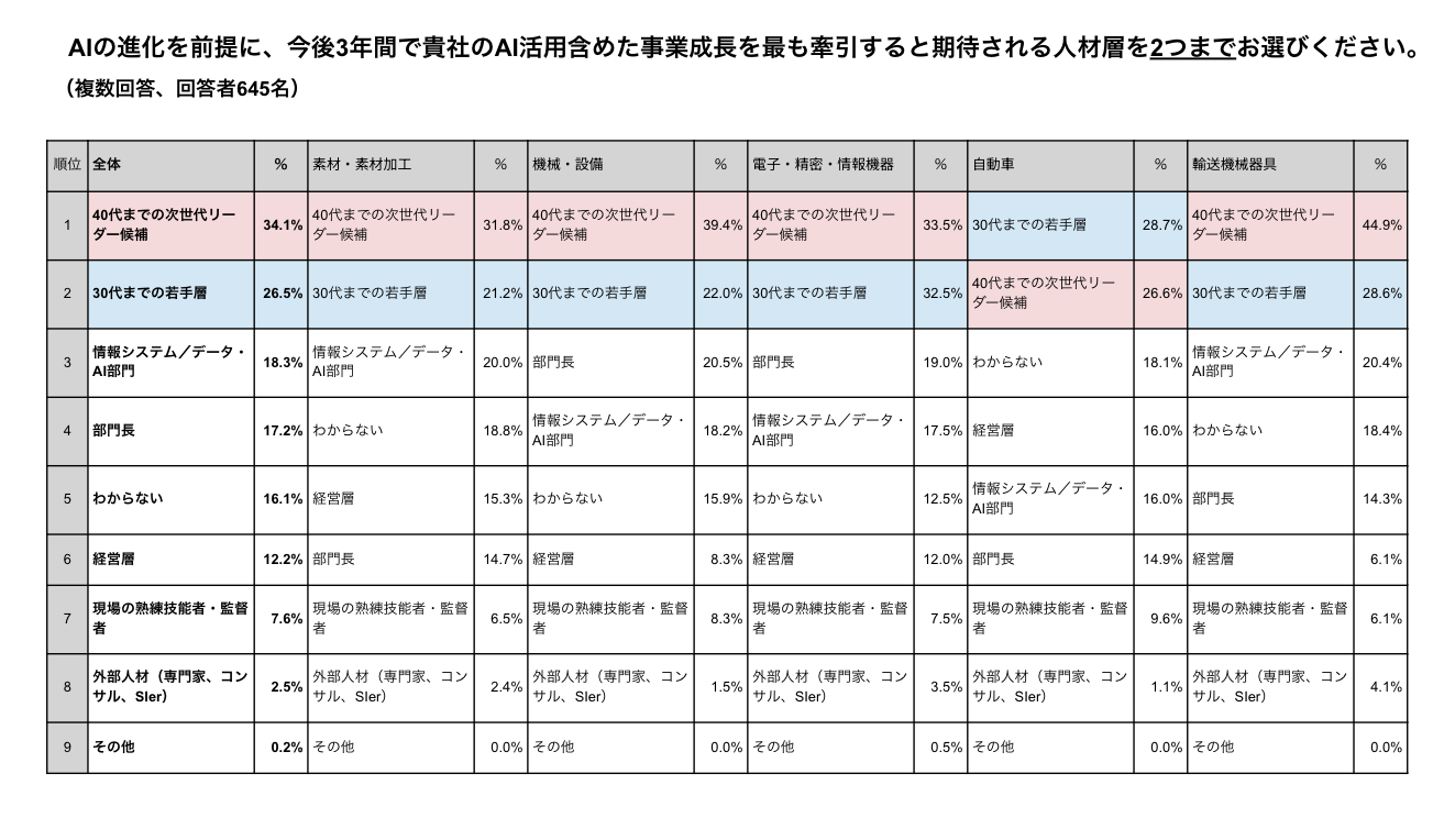 ・今後3年でAI活用を含む事業成長を牽引する人材層として「40代までの次世代リーダー候補」「30代までの若手層」に期待が寄せられていることが明らかになりました。