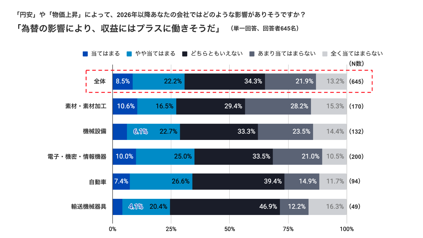 ・一方で、「為替の影響により収益にはプラスに働きそうだ」とした人は全体で30.7%にとどまり、最も多い電子・精密・情報機器でも35.0%と、プラス影響は相対的に限定的でした。これらより、円安・物価上昇による収益構造への影響は、業界全体としてプラスよりもマイナス側面が大きく捉えられていることが明らかになりました。